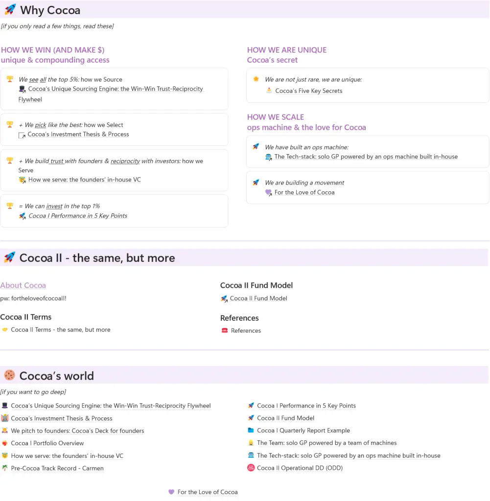 Cocoa I (2022) was a $17M fund, mainly backed by tech founders. Eternally grateful – there wouldn’t be Cocoa without Cocoa I.